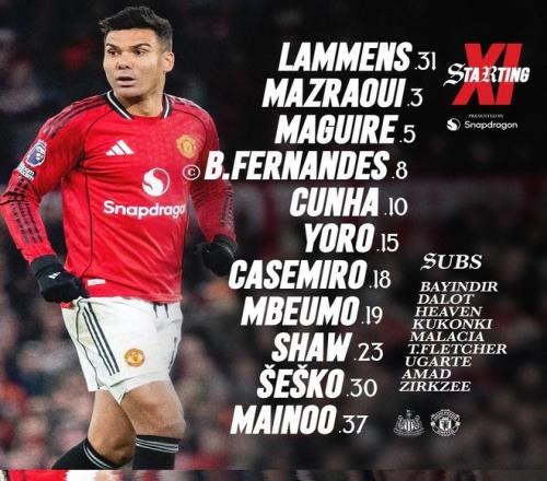 曼聯(lián)首發(fā):31-拉門斯、3-馬茲拉維、5-馬奎爾、15-約羅、23-盧克-肖、18-卡塞米羅、37-梅努、8-布魯諾-費爾南德斯、10-馬特烏斯-庫尼亞、19-姆伯莫、30-謝什科