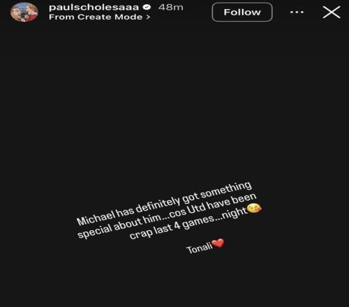 斯科爾斯在社交媒體發表動態,寫道:“邁克爾(卡里克)身上肯定有某種特別之處,因為曼聯最近四場比賽踢得簡直爛透了……晚安托納利??”