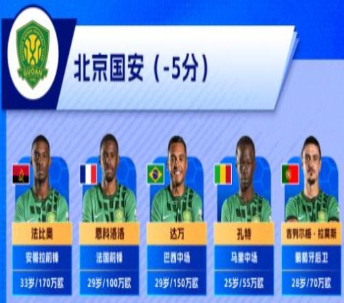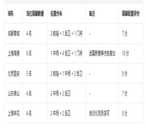 北京國安擁有5名當紅國腳,包括2前鋒+1中場+2后衛;山東泰山擁有4名當紅國腳,包括2中場+2后衛;上海申花擁有4國腳,2中場+2后衛,外加歸化李可。