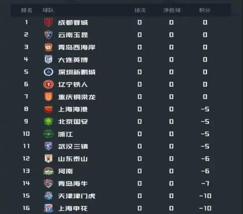 申花-10分;泰山-7分;國安、海港-5分;蓉城不負分。