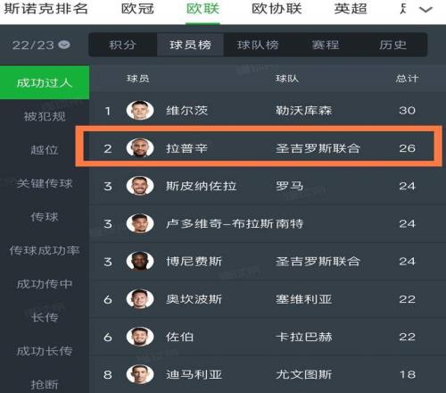 第二個,拉普辛還是歐聯杯助攻王,22到23賽季,他在歐聯杯完成4次助攻,并列那個賽季歐聯杯的助攻王,而且也是歐聯杯成功過人榜第2名,第1名是誰呢?就是現在身價1.1億歐的利物浦球星維爾茨。