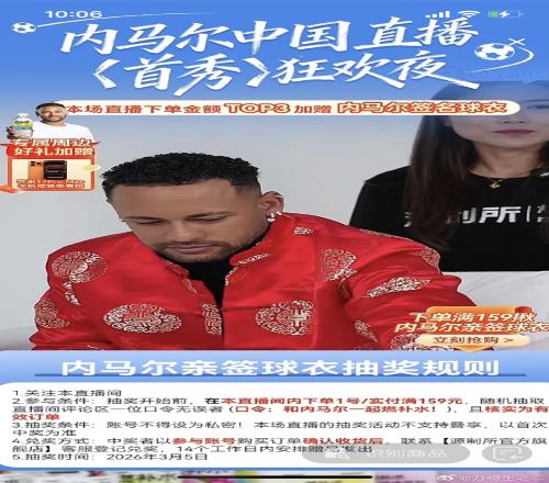 在直播中內(nèi)馬爾身穿一襲中國(guó)元素服裝,為某品牌飲品帶貨,下單實(shí)付滿159元,還能參與抽取內(nèi)馬爾簽名球衣。