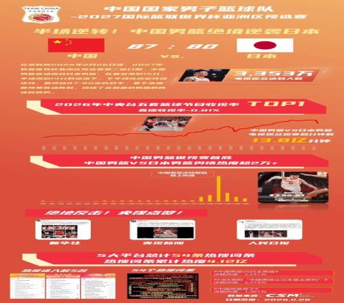 除了官方媒體大篇幅的報道、點贊與點評,我們還看到大家自發發布的社交媒體,剪輯的逆轉名場面、球員高光瞬間,這些內容在各大平臺的傳播廣泛。面對日本首戰,5大平臺產生54條相關熱搜,熱搜詞條累計熱度4.12億;本場比賽的直播收視率0.81%,位列2026年中央臺五套籃球節目收視率第一位;比賽電視觀眾達到人數3353萬人,觀賽總分鐘數13.8億分鐘。