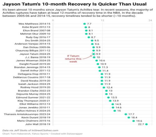 如果塔圖姆選擇直接報銷本賽季,他將休養約17個半月,和杜蘭特的時間表基本一致。