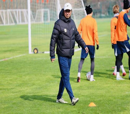 韓鵬抵達訓練場后和助手趙碩先進行短暫交流,隨即走向訓練場,開啟正式的訓練。體能教練巴雷納帶隊慢跑,他接替文虎一的角色,主要負責訓練的執行。從訓練的內容看,泰山隊全隊慢跑后是傳接球的練習,緊接著是游戲環節,隊員們分成四組,每組將五個標志錐放在指定位置,然后球員接連射門擊倒標志錐,誰先完成誰就勝出。第一組,克雷桑、馬德魯加領銜的外援組勝出。