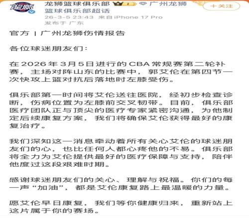 賽后,俱樂部也就郭艾倫的傷情發表官方公告,文中說到: 俱樂部第一時間將艾倫送往醫院,經初步檢查診斷,傷病位置為 左膝前交叉韌帶 。 目前,俱樂部醫療團隊正與頂尖的醫療專家緊密溝通,為他制定后續康復方案,我們將確保艾倫獲得最好的康復治療。