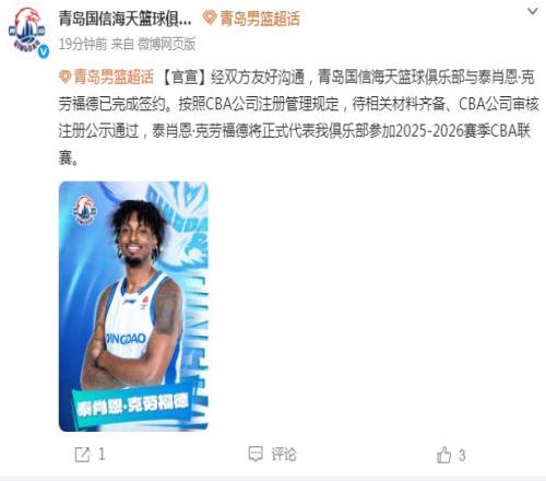 青島男籃官方曬出泰肖恩-克勞福德加盟的海報(bào),并且在公告寫(xiě)道:“經(jīng)雙方友好溝通,青島國(guó)信海天籃球俱樂(lè)部與泰肖恩-克勞福德已完成簽約。按照CBA公司注冊(cè)管理規(guī)定,待相關(guān)材料齊備、CBA公司審核注冊(cè)公示通過(guò),泰肖恩-克勞福德將正式代表我俱樂(lè)部參加2025-2026賽季CBA聯(lián)賽。