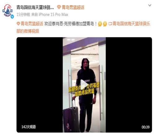 泰肖恩-克勞福德已經(jīng)抵達(dá),并且表示:“這是我第二次來(lái)中國(guó),很感恩能獲得這個(gè)機(jī)會(huì),期待從每個(gè)人身上學(xué)習(xí)、讓自己變得更好,迫不及待開(kāi)始工作。”