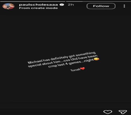 在英超第29輪比賽中,曼聯(lián)客場(chǎng)1-2慘遭10人作戰(zhàn)的紐卡斯?fàn)柦^殺,卡里克也迎來了他執(zhí)教球隊(duì)的首場(chǎng)失利。在比賽結(jié)束后,曼聯(lián)名宿、曾經(jīng)與卡里克并肩作戰(zhàn)多年的斯科爾斯公開炮轟老友,直言其治下的曼聯(lián)表現(xiàn)“爛透了”。他在一條Instagram快拍中連夜寫道:“卡里克身上絕對(duì)有什么‘特別之處’,畢竟曼聯(lián)過去四場(chǎng)比賽爛透了……晚安。”斯科爾斯甚至還配了一個(gè)親吻表情,隨后寫下“托納利”,并在這位紐卡斯?fàn)柷蛐敲趾竺婕恿艘活w愛心。