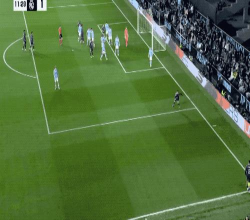 第11分鐘,皇馬開出戰(zhàn)術(shù)角球,居萊爾倒三角傳中,瓊阿梅尼無(wú)人盯防,推射擊中立柱,彈進(jìn)球門。