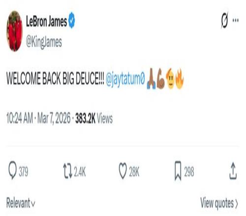 41歲詹姆斯也在第一時(shí)間隔空送上祝福:“歡迎回歸,Big Deuce(塔圖姆的外號(hào))。”