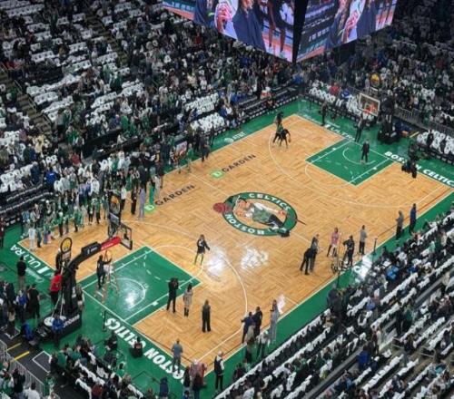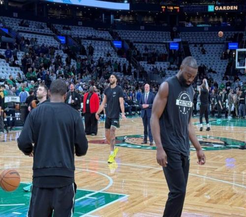時隔近十個月從跟腱傷勢中迎來復出的塔圖姆,在開場前一個半小時便早早出場熱身。當雙探花再次同框熱身時,凱爾特人仿佛又回到了那支“東部之王”的無解姿態。為了迎接當家球星的歸來,TD花園球館全場鋪滿了三葉草T恤,距離開賽還有一個小時,球館內就已經人聲鼎沸。