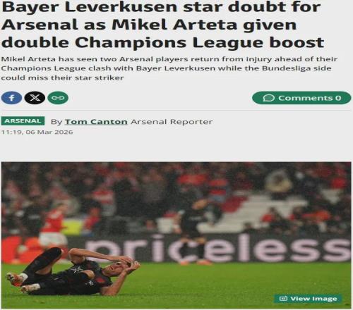 倫敦足球消息,阿森納在對勒沃庫森的兩回合歐冠淘汰賽前收獲了利好,對方前鋒希克有可能會缺陣對槍手的關鍵戰。
