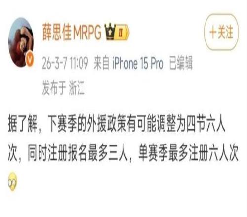 據媒體人“球圈趙探長”和上海男籃跟隊記者薛思佳透露,在CBA全明星周末期間的投資人大會上,對下個賽季的外援政策、工資帽、國內球員合同方面進行了調整。外援政策方面,由目前每支球隊能夠同時注冊4名外援調整為3名外援;將賽季最多注冊8人次調整為賽季最多注冊6人次。外援工資帽上,分為三檔階梯向下浮動。具體方案為:如球隊打到常規賽,工資帽為400萬美元;如球隊打到八進四及十二進八,工資帽上浮為450萬美元;如球隊打到總決賽及半決賽,工資帽繼續上浮為500萬美元。