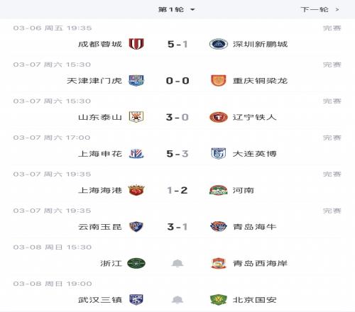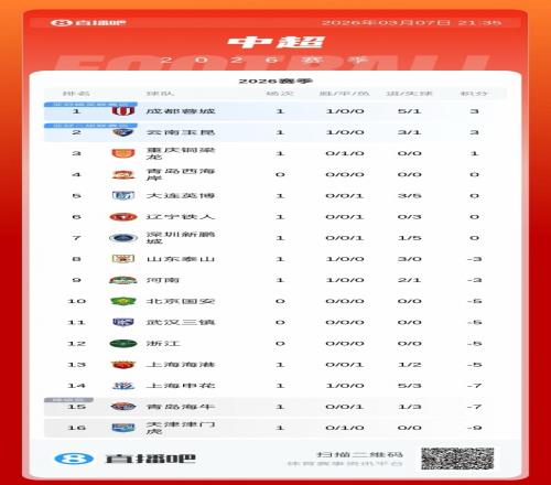 體育播報03月07日宣 中超首輪結(jié)束前6場比賽的較量,最新積分榜如下。明天本輪最后兩場,浙江vs青島西海岸,三鎮(zhèn)vs國安。