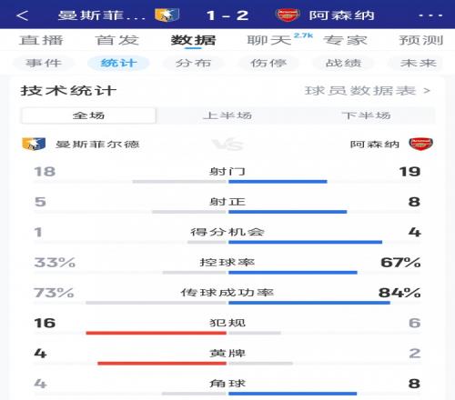 體育播報(bào)3月7日宣 在本輪足總杯,阿森納2-1擊敗曼斯菲爾德,以下為雙方全場(chǎng)數(shù)據(jù)對(duì)比: